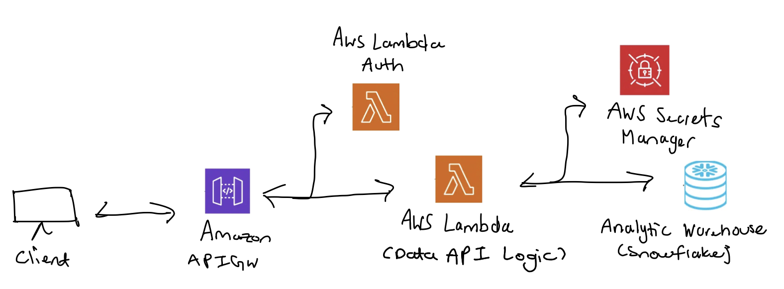The data API logic layer simply translates the HTTP request into a Snowflake query and returns the result. Snowflake because that is where our data was primarily stored. And lastly, AWS Secrets Manager was used to store the